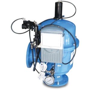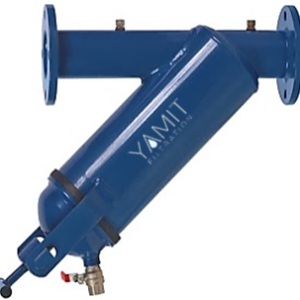 El agua entra al filtro en forma tangencial, lo que da un flujo espiralado que por fuerza centrífuga separa las partículas sólidas hacia las paredes del filtro, mientras que la parte central permanece mayormente limpia y sale por la toma superrior. Las partículas separadas caen a un depósito que se drena abriendo una válvula -automatizable- de descarga. Cuerpo del filtro en acero al carbono, recubierto con pintura epoxi en caliente.